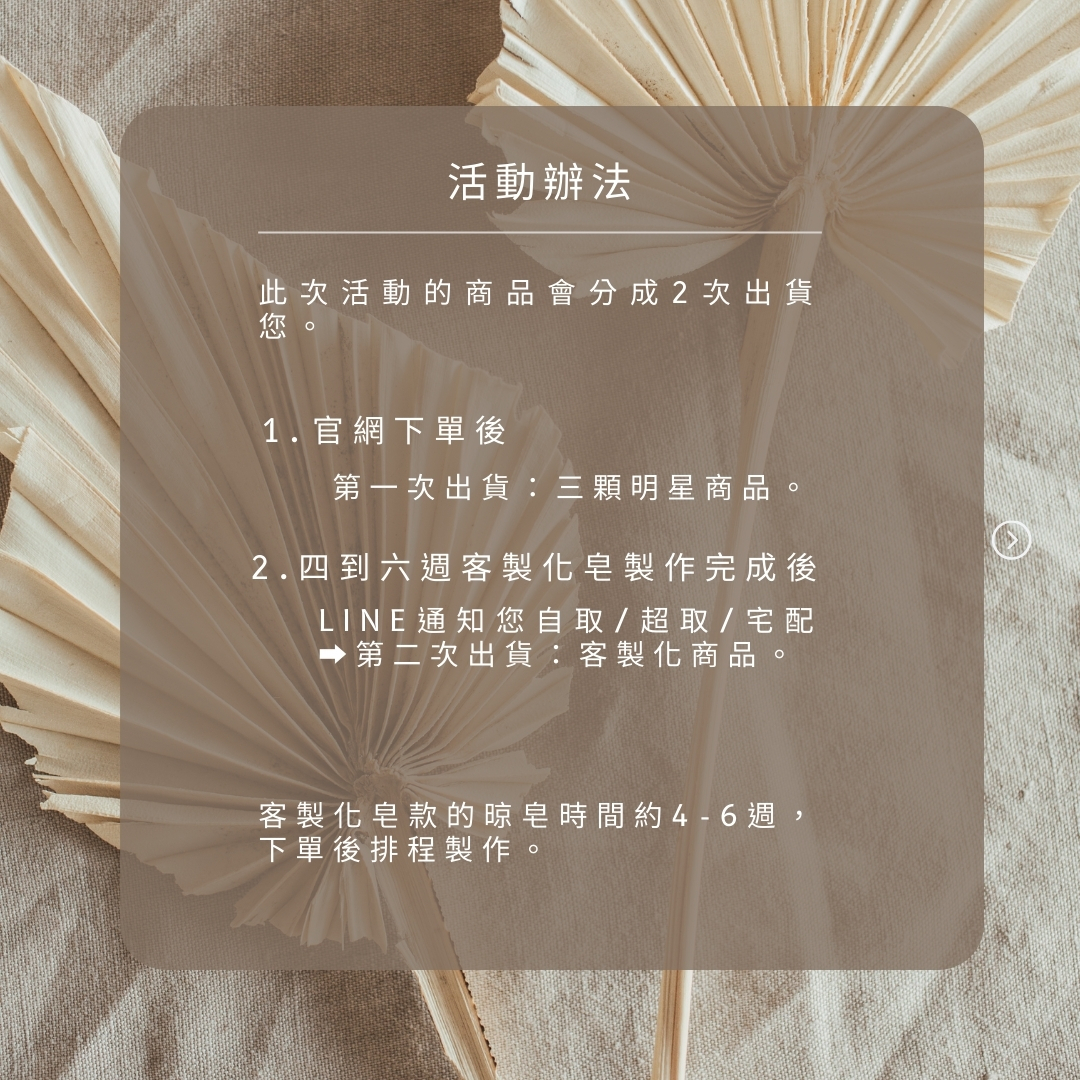 購買3顆指定皂款,即免費贈送純手工客製化屬於您的皂款5顆 (市值1250元)